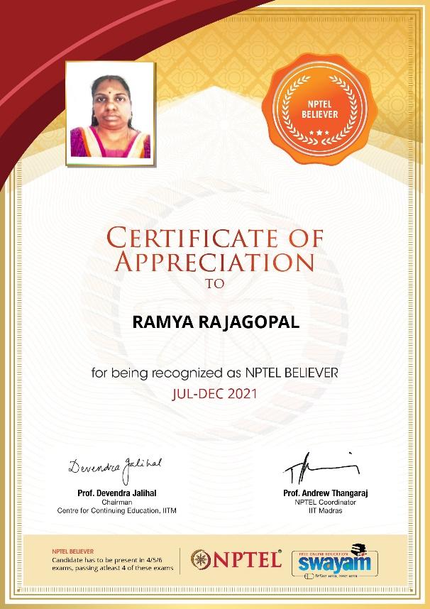 Ms. R. Ramya, Ph.D. student, Dept. of Fisheries Biotechnology has received two appreciation awards NPTEL BELIEVERS for July-Dec 2021 and NPTEL ENTHUSIASTS for Jan-Apr, 2022 from NPTEL for her completion of eight different online courses from the NPTEL portal. Dr. S.A. Shanmugam, Dean (Basic Sciences), congratulated the student