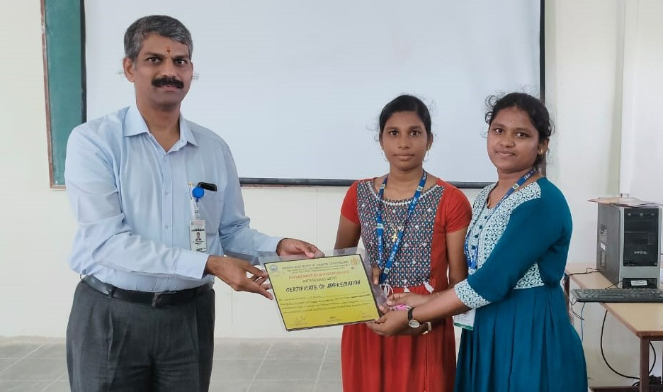 G.M Dharsica and P.Dayana won the First prize in the National level Technical Symposium in “BIOMERAKI 2K23” at Anand Institute of Higher Technology, Chennai